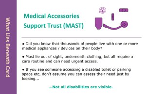 We’ve put together a double sided information card to promote awareness about the existence of hidden medical accessories, as well as basic information about the different medical appliances and devices, that people may have. Its handy business card size, means single or multiple cards can be carried around in a bag or wallet and used if and when an occasion arises. We’ve also produced an A4 poster with the same information, for places where a static sheet or leaflet would be useful. Both can be downloaded by clicking on the relevant PDF below.